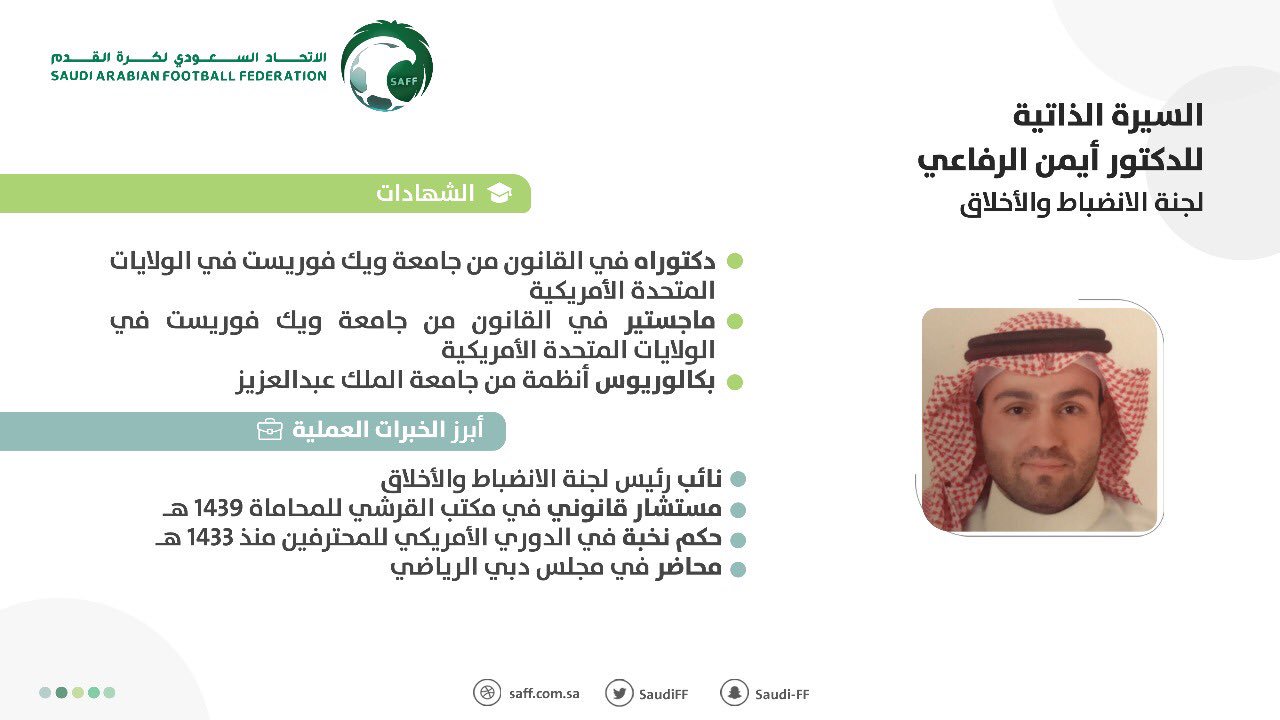 الاتحاد السعودي لكرة القدم Su Twitter دكتوراه في القانون مستشار قانوني حكم نخبة في الدوري الأمريكي للمحترفين محاضر في مجلس دبي الرياضي إليكم السيرة الذاتية لرئيس لجنة